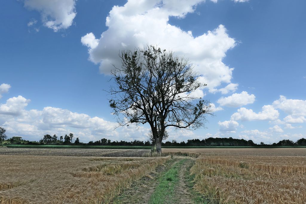 Was mag der damalige Flurstücksbesitzer wohl mit der Baumpflanzung bezweckt haben? Wollte er einfach seinen Besitz markieren? Wollte er damit eine gerade, dem Grenzverlauf entsprechende Bewirtschaftung erleichtern? Wollte er ein paar Gehölze in die ausgeräumte Landschaft bringen? War er Jäger und wollte sich etwas Deckung für einen Jagdsitz schaffen?