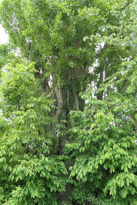 Die Blattstielgallen (kleines Bild unten) kommen häufig bei Schwarzpappel und der Pyramidenpappel vor, kaum bei der Kanadischen Pappel. Großes Bild: im Hintergrund die Pyramidenpappel (1).