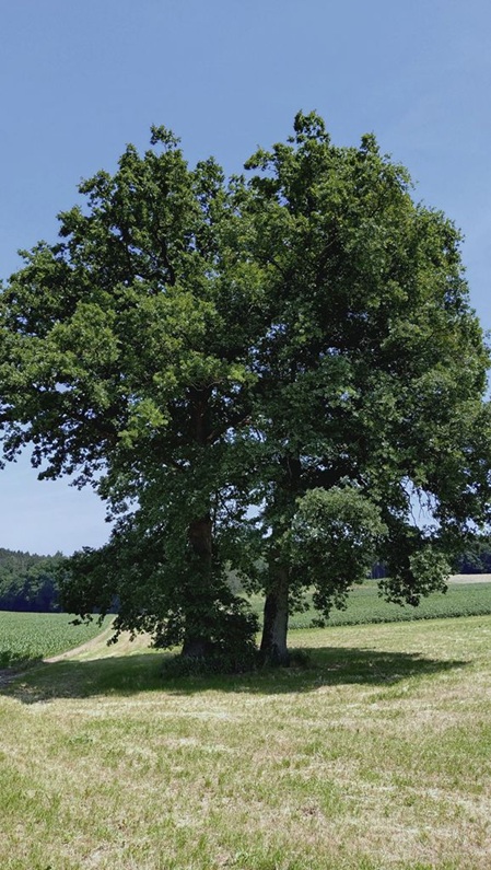 - es stehen hier zwei Stieleichen nebeneinander und bilden eine Krone, der Baum mit dem etwas stärkeren Stamm wird hier beschrieben