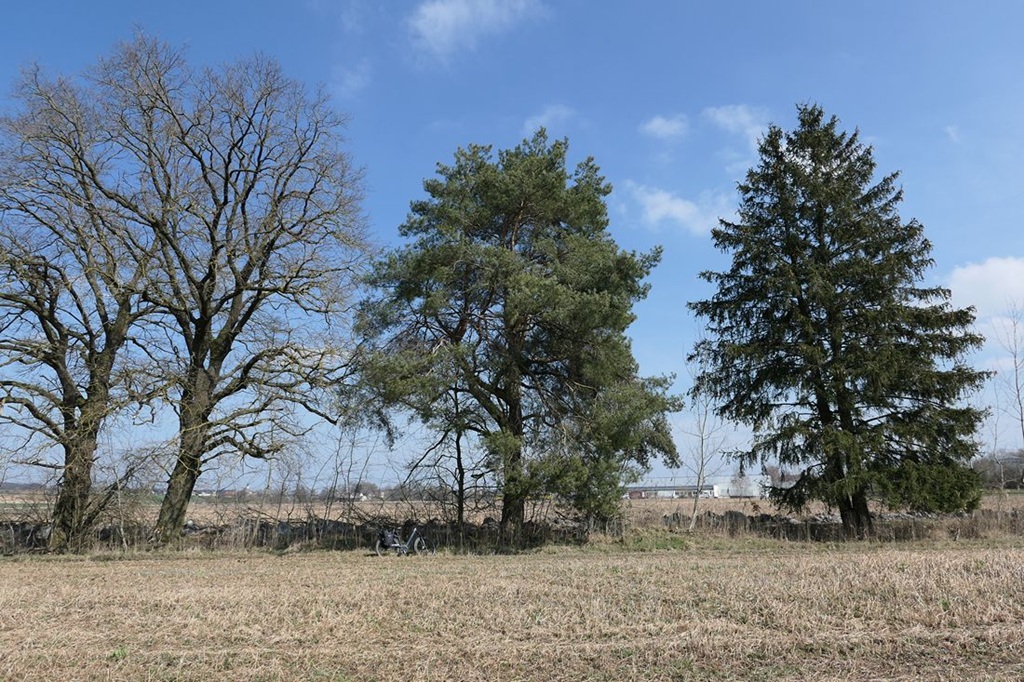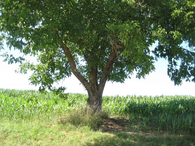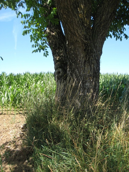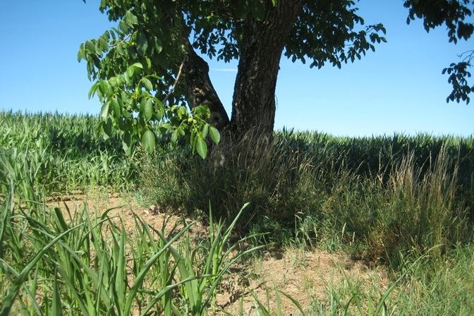 Auch wenn man es vielleicht auf den ersten Blick nicht sieht: der Nussbaum steht nicht am Rand, sondern ein paar Meter im Feld des Landwirts vom Hof gegenüber.