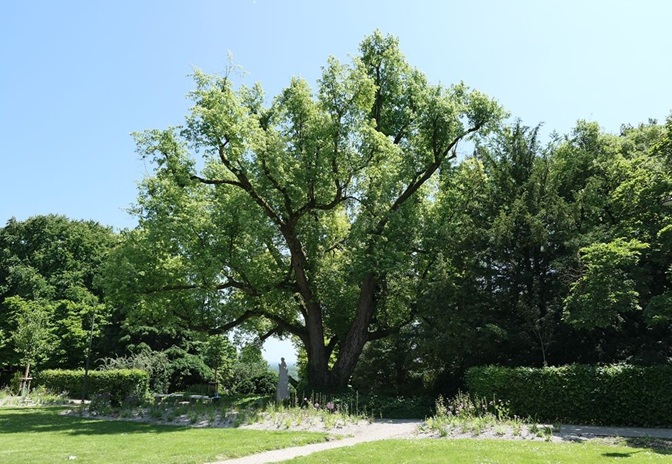 Ein Schild bei dem Baum nennt als Herkunft Hohenheim und als Pflanzjahr 1960. Demnach dürfte dieser Baum rund 70 Jahre alt sein und zu den ersten Nachkommen der Hohenheimer Sämlinge gehören.