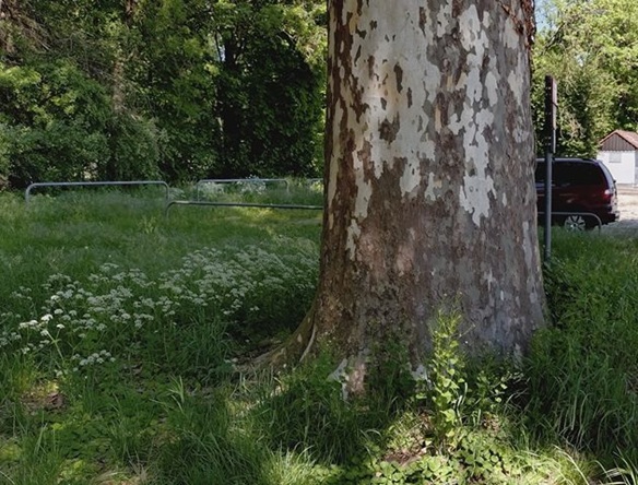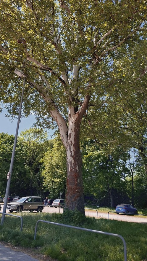 - eine teilversiegelte Fläche reicht bis nahe an den Stamm
