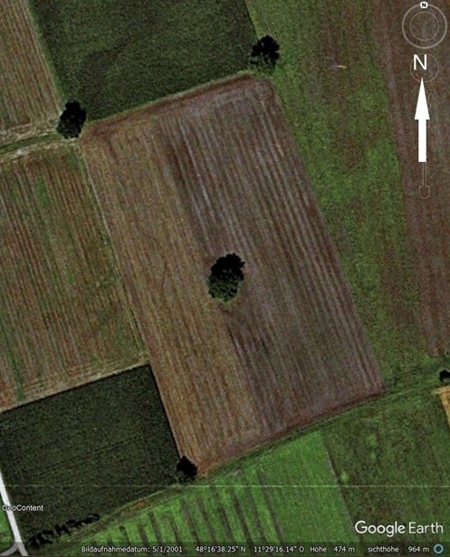Die hier beschriebene Esche steht im nordwestlichen Eck des in Abb. 1 zentral erkennbaren Flurstücks. Der Kartenausschnitt zeigt, dass an drei Ecken und in der Mitte des rechteckige Grundstücks jeweils ein Baum wächst (in mindestens einem Fall wohl eine Zweiergruppe). Im vierten Eck war zeitweise eine Fläche zur Lagerung von vermutlich Stallmist eingerichtet.