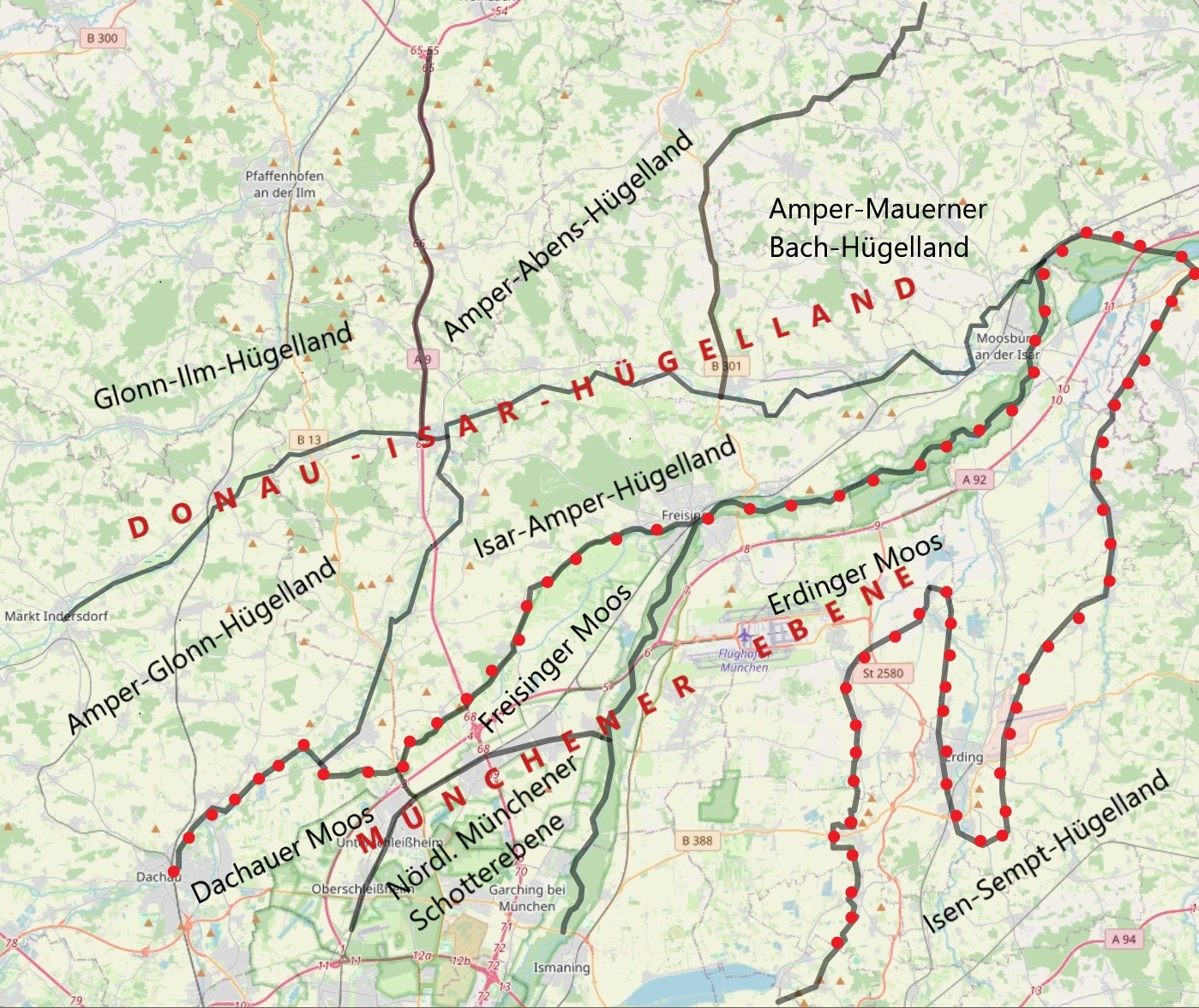 Die Bezeichnung der Naturräume auf dieser Website erfolgt für den Raum Frankfurt nach der Naturräumlichen Gliederung für Hessen (Naturräumliche Haupt- und Untereinheiten, 165), für den Raum Freising nach Abb. 1 (in Anlehnung an die Naturräumliche Gliederung Bayerns (161) und die Standortkundliche Karte Bayerns (164); Kartengrundlage OpenStreetMap (20)).