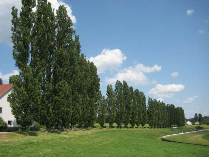 - in einer Baumreihe aus etwa 30 Pyramidenpappeln, dritter Baum von Westen (im Bild: von links)