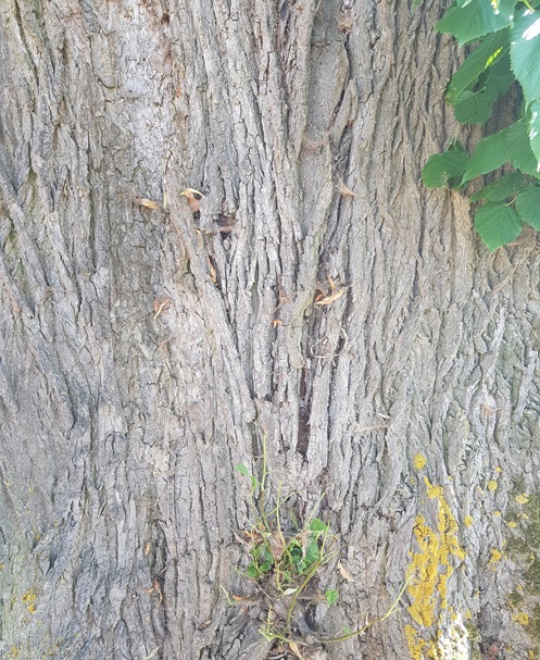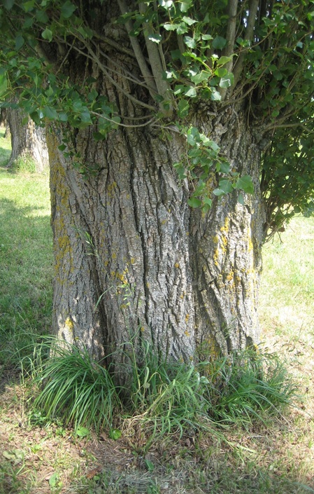 - Merkmale, die für eine Schwarzpappel sprechen: keine Drüsen an der Blattbasis, junge Äste rundlich, junge Blätter hellgrün, netzartige Borkenrippen