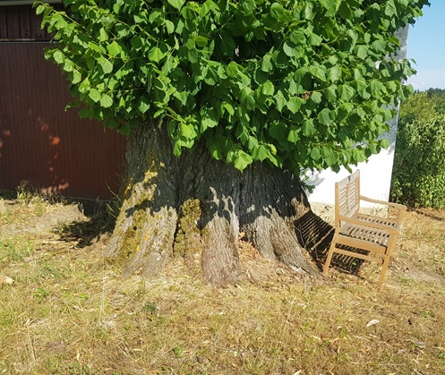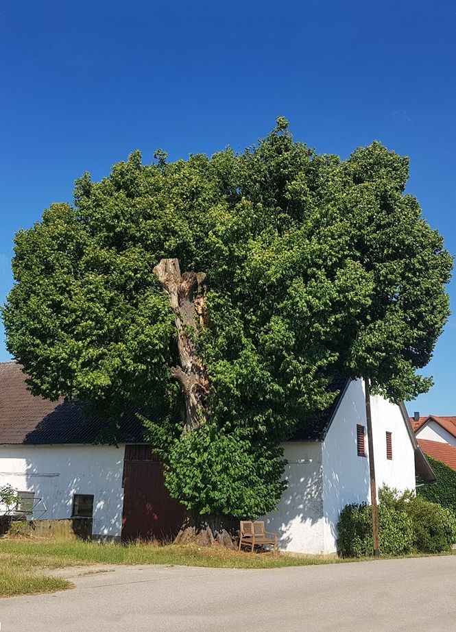 Die Kronäste sind gekürzt, vermutlich um den Baum zu entlasten und die Verkehrssicherheit zu gewährleisten. Deshalb ist die Linde nur noch ca. 16 m hoch. Ihre Krone wächst aber immer noch weit über das daneben stehende landwirtschaftliche Gebäude.