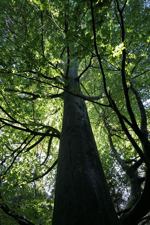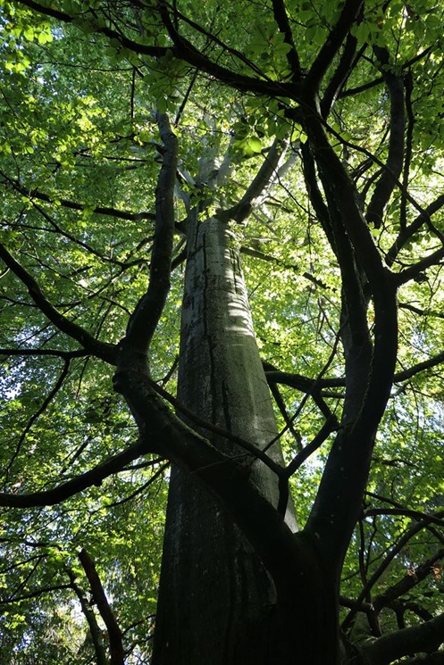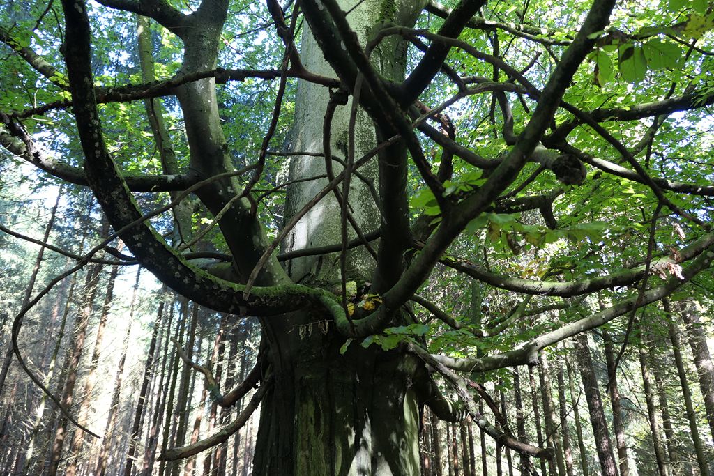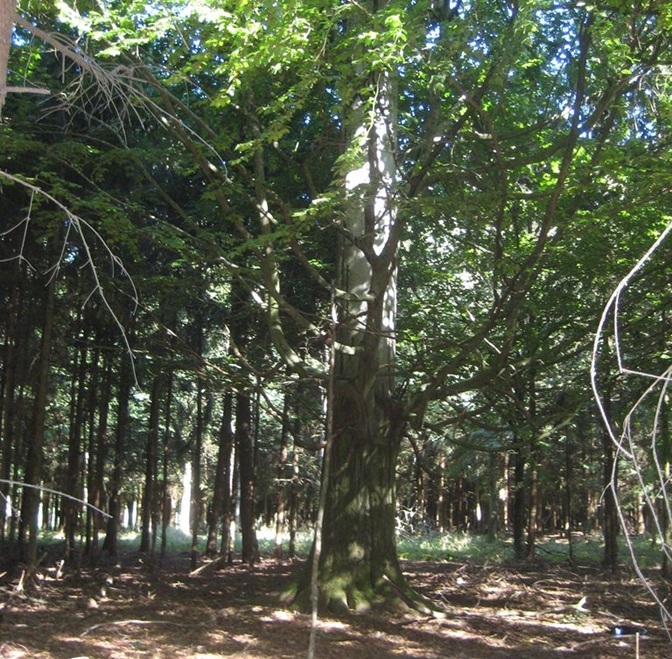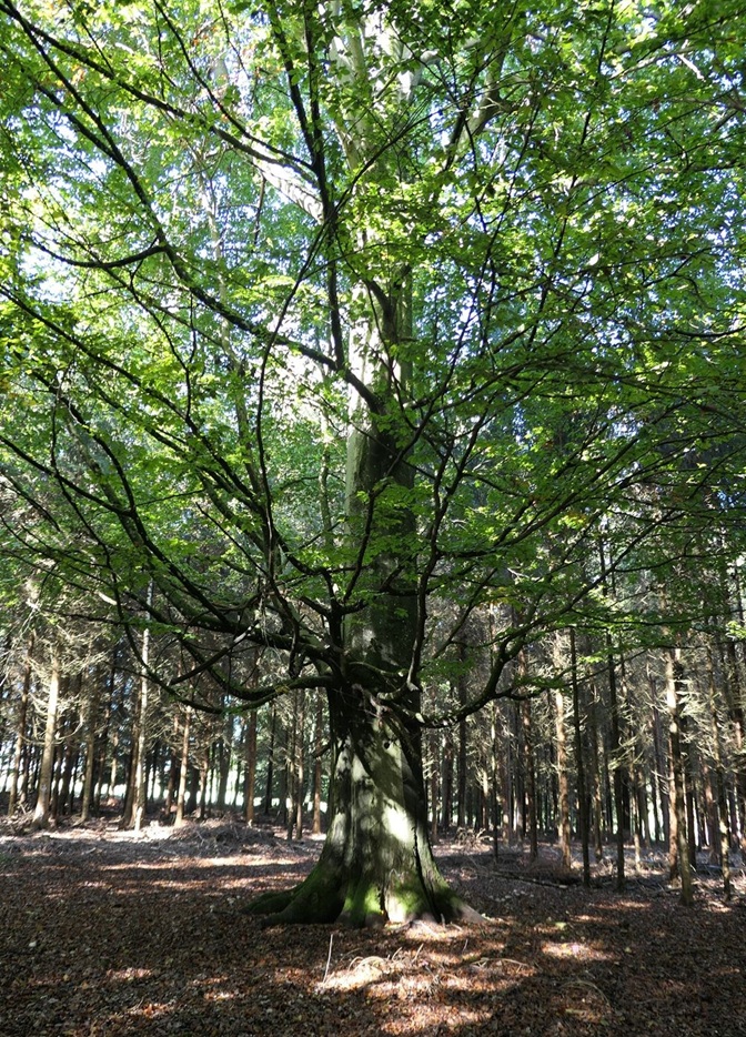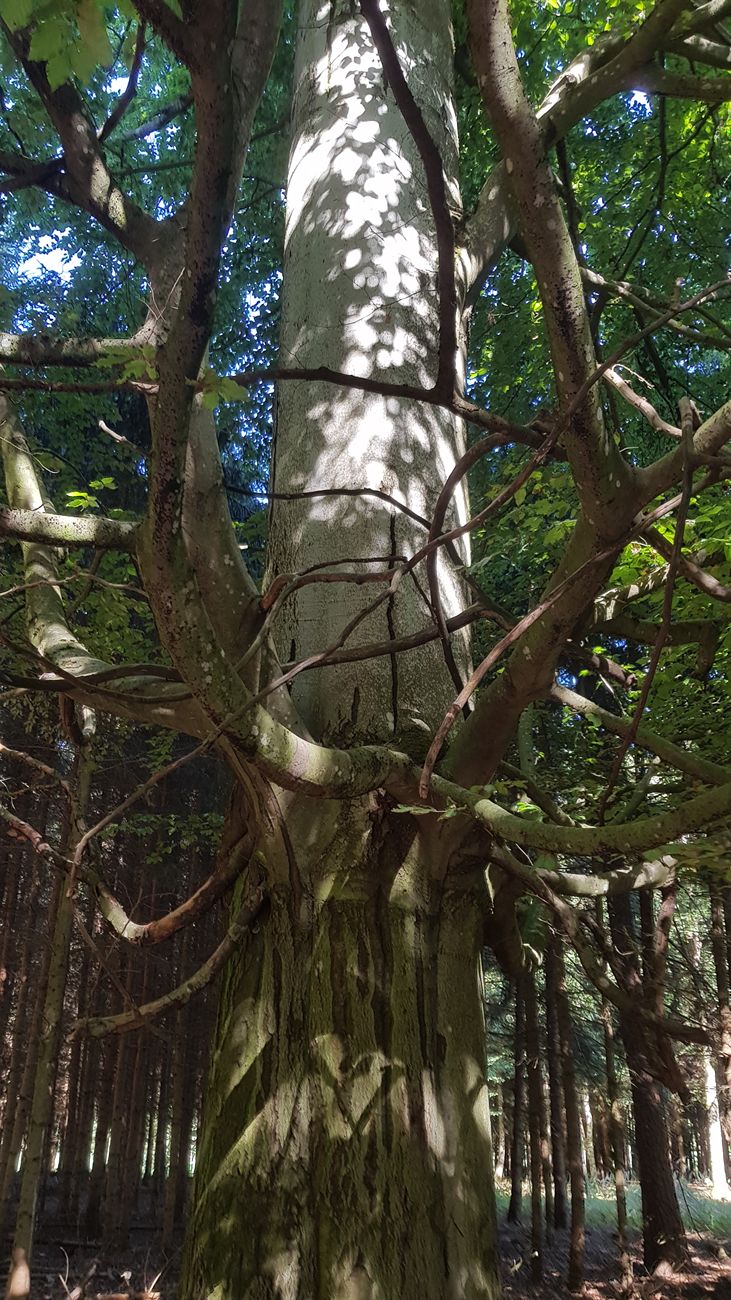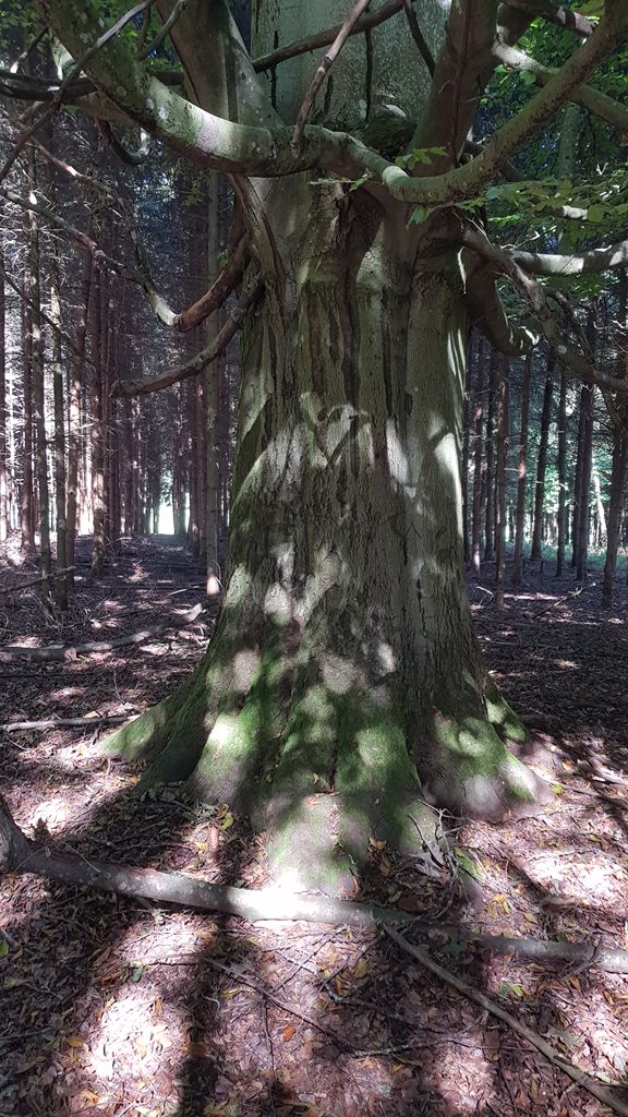 Im Wald östlich des Weilers Schatz bei Nandlstadt stehen mindestens drei alte Rotbuchen. Als ich durch den Wald ging, standen sie plötzlich vor mir und ließen mich an einen verwunschenen Märchenwald denken. Zwei davon haben es als Starke Bäume hierher geschafft. Sie sind deutlich älter als der in Reih und Glied gepflanzte Fichten-Stangenwald, der um die Buchen herum wächst und überragen ihn um etliche Meter. Die historische Flurkarte von 1806 zeigt allerdings bereits einen Nadelwald an dieser Stelle.