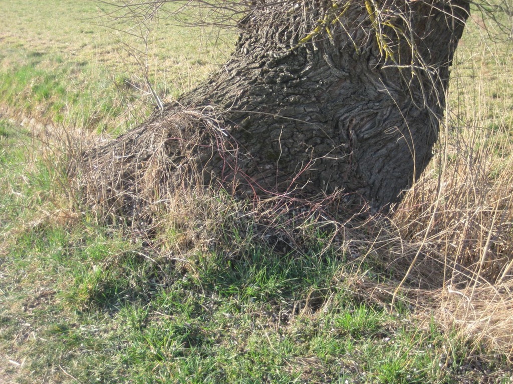 Wer hat die Weide zur Seite geschoben? Erst bei näherem Hinsehen erkennt man, dass der untere Teil des Stammes für etwa einen Meter nahezu waagrecht von der Straße weg steht, bevor er sich in die Senkrechte begibt. Irgendjemandem scheint der Baum in frühen Jahren im Weg gewesen zu sein. Immerhin steht er noch. Weiden sind zäh.