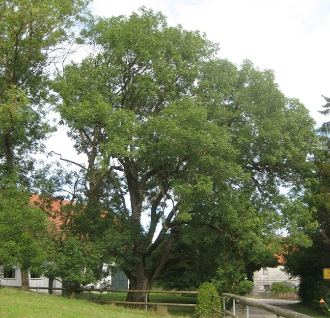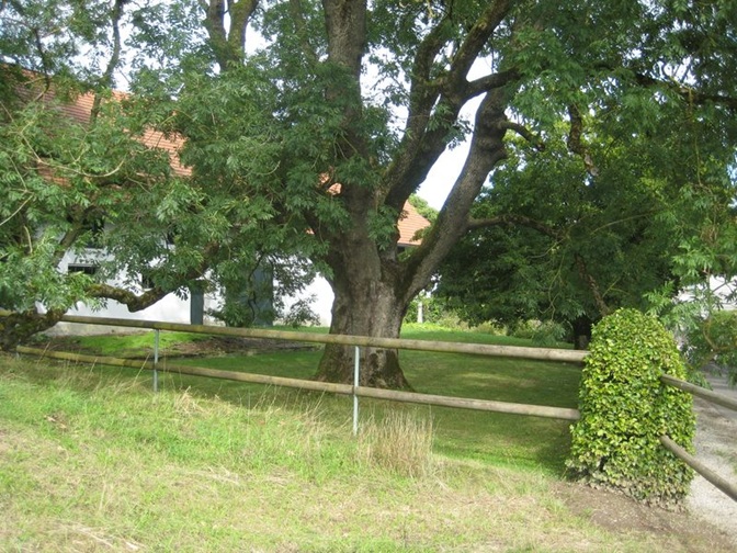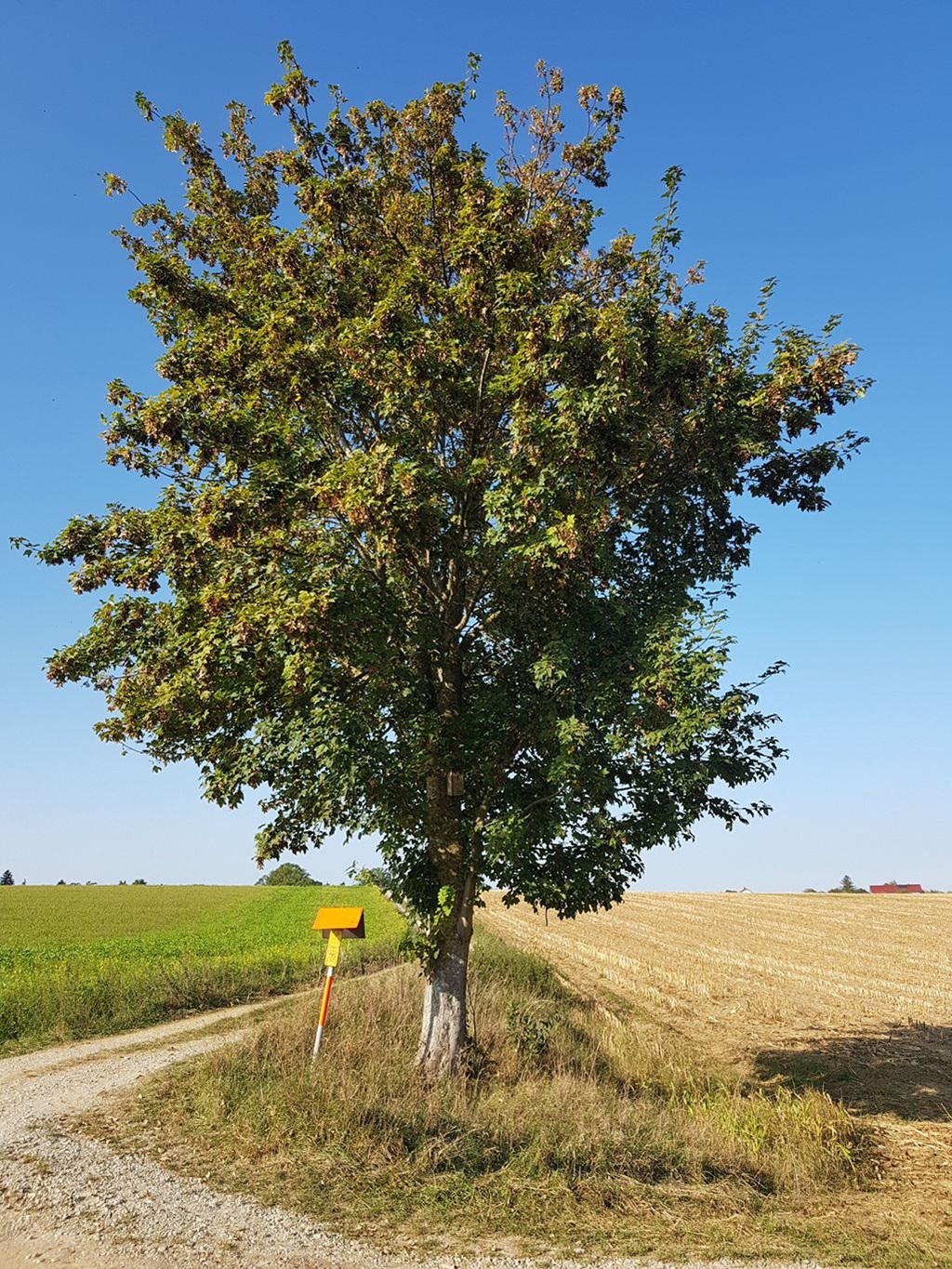 Kein mächtiger Baum, aber in der sonst ausgeräumten Landschaft fällt er schon von Weitem auf. Der Besitzer vermutet, dass sein Großvater den Baum gepflanzt hat. Vielleicht ist der Setzling bei einer Neupflanzung im Wald übrig geblieben. Eine Verbreitung durch Wind oder Tiere ist in dieser Gegend unwahrscheinlich.
