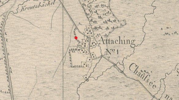 Blatt "70 Dachau" des "Topographischen Atlas vom Königreich Baiern" (1827-1840) zeigt auf der Westseite des Orts Attaching eine Baumreihe, die den ortsnahen Ackerflächen wohl als Windschutz dienen sollte (Abb. 1, roter Punkt = Standort der Stieleiche). Eine andere Quelle nennt für die gleiche Zeit hunderte von Eichen, "die das ganze Attaching gegen Freising so umhüllten, dass nur die Spitze des Kirchturms darüber hinaus ragte". Thomas Petuel ließ um 1850 diese Attachinger Eichen roden. "Er habe Eiche um Eiche geschlagen und zu Türen und Fensterstöcken verarbeiten lassen", heißt es.