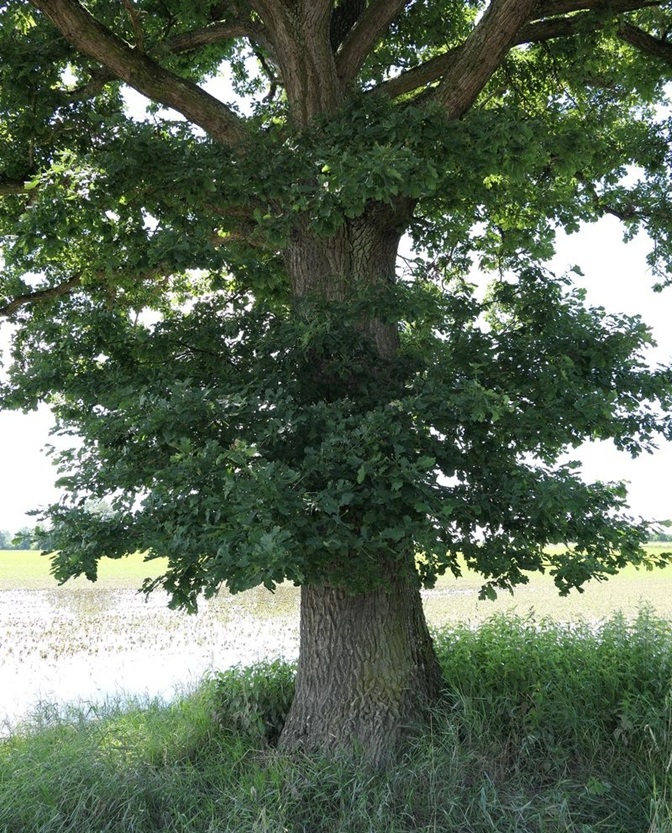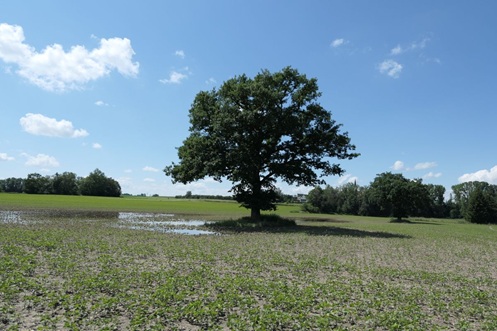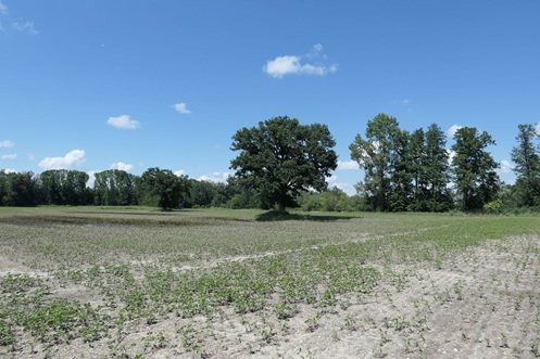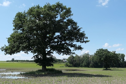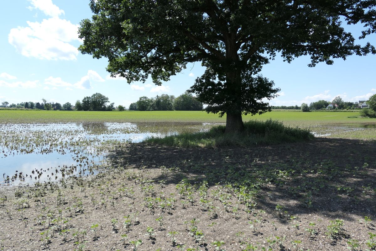 Nach den hohen Niederschlägen der letzten Wochen kam es auch in den Ortschaften entlang der Amper zu schweren Schäden durch Hochwassser. Auf meiner Tour zu diesen beiden Flurbäumen bei Feldkirchen fuhr ich eine längere Strecke durch das Ampertal. Obwohl der Pegel der Amper inzwischen wieder deutlich unter dem der Meldestufe 1 gefallen ist (139), waren immer noch viele Äcker überschwemmt. Den Stieleichen im Gewann "Bei den Eichen" macht das nichts aus, den Sojabohnen auf dem Feld schon (s. u.).