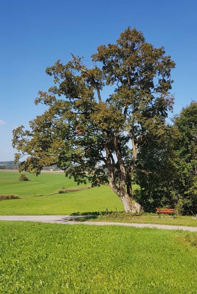 Auf der neben dem Baum stehenden Bank sitzend überblickt man das ganze Ampertal bis nach Palzing.