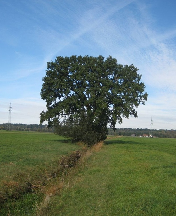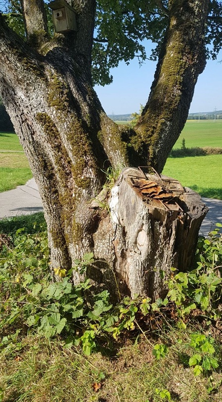 Von Itzling geht es steil durch einen Hohlweg hinunter ins Ampertal. Dort wird man von einem einstmals mächtigen Feldahorn empfangen. Der Feldahorn hat es als "Feldahorn bei Haindlfing" zu einem Wikipedia-Eintrag gebracht, obwohl er näher bei Itzling und auch auf Itzlinger Gemarkung steht. Nach Wikipedia war er einer der stärksten Feldahorne Deutschlands. Leider ist von einem der Hauptstämme inzwischen nur noch der Stumpf da. Den hat der Baum vor gut zehn Jahren verloren, ob aus Altersschwäche oder Blitzschlag, da gehen die Erzählungen auseinander.