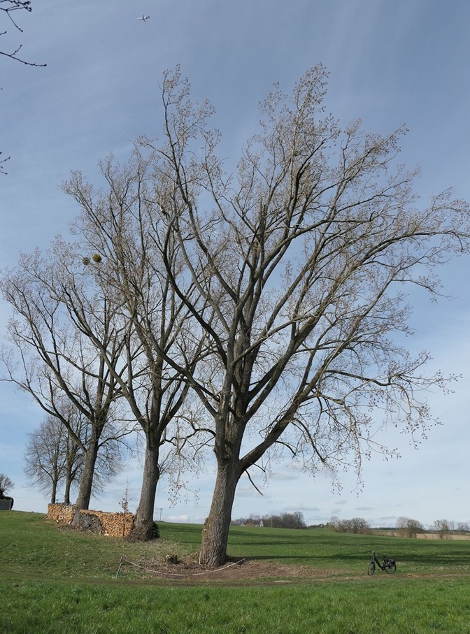Die Bäume hat der Vater des heutigen Hofbesitzers gepflanzt. Auf einer der drei Pappel wachsen Mistelnester, ein starkes Indiz für die Kanadische Pappel bei der Abgrenzung zur Schwarzpappel.