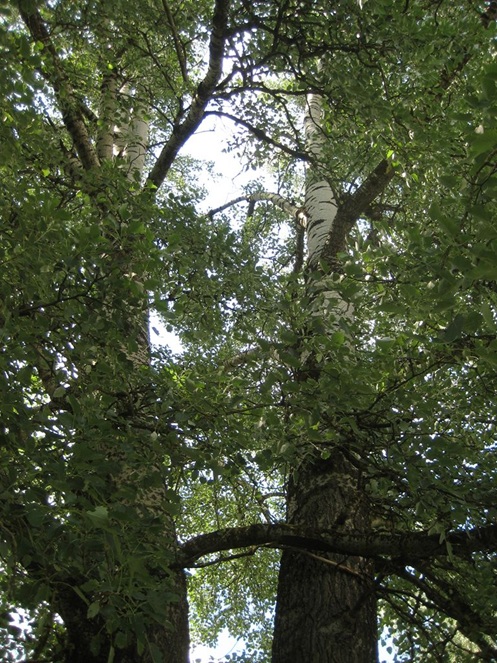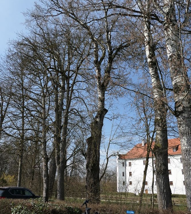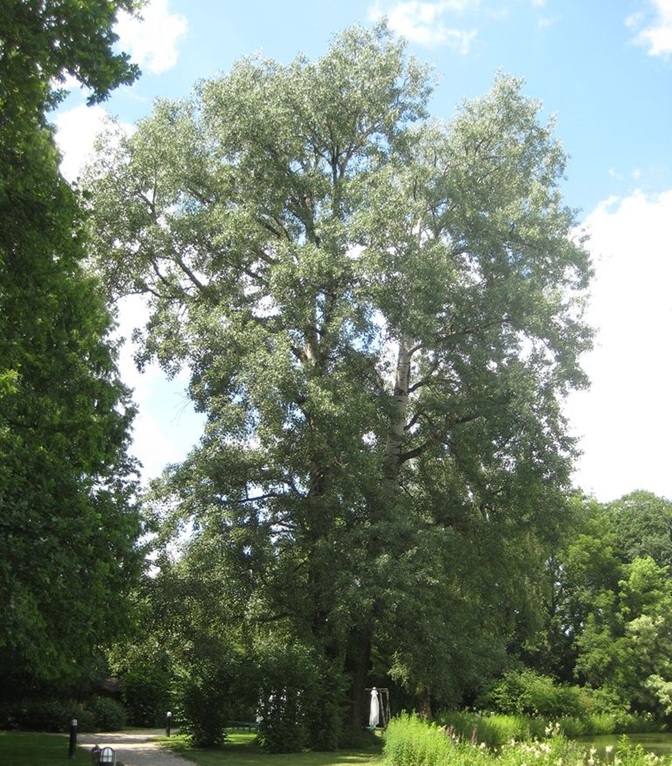Der Baum ist eine der stärksten Graupappeln in Deutschland und als "Espe/Zitterpappel" beschildert. Leider spaltet sich unter dem Gewicht der beiden Teilkronen der Stamm zusehens. Eine Verstrebung der beiden Stämme mit einem Drahtseil wäre sicher hilfreich.