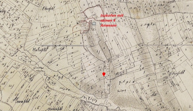 In Höhe des Weilers entspringen aufgrund einer wasserstauenden Gesteinsschicht auch heute noch einige Quellen. Ein Teil davon wurde im eingezeichneten Teich aufgefangen und durch die sich nach Süden ziehende schraffierte Mulde in den Haselbach geleitet. Die Mulde wurde als Grünland genutzt (weitgehend waagrecht gepunktete Linien).