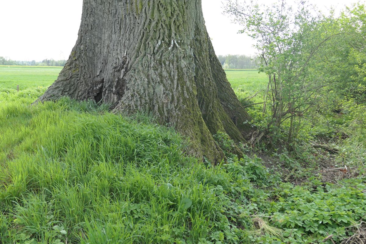 Die drei Karten zeigen den gleichen Ausschnitt mit der Stieleiche in der Mitte. Die historische Flurkarte (um 1850, linkes Bild) zeigt als Baumstandort einen diagonal durch das Bild verlaufenden Ranken, der die Acker-Grünland-Grenze zur südöstlich liegenden Amper-Aue bildet. Auf den beiden Luftbildern ist der Verlauf des früheren Rankens gut zu erkennen, er existiert heute aber nur noch im unmittelbaren Bereich der Eiche. Das tiefer liegende Gebiet der Amperaue mit dem geringeren Abstand zum Grundwasser wird durch unterschiedlichen Vegetationsstand auf dem durchgehend gleich bewiortschafteten Flurstück (mittleres Bild) und durch die dunklere Bodenfarbe (rechtes Bild) sichtbar.