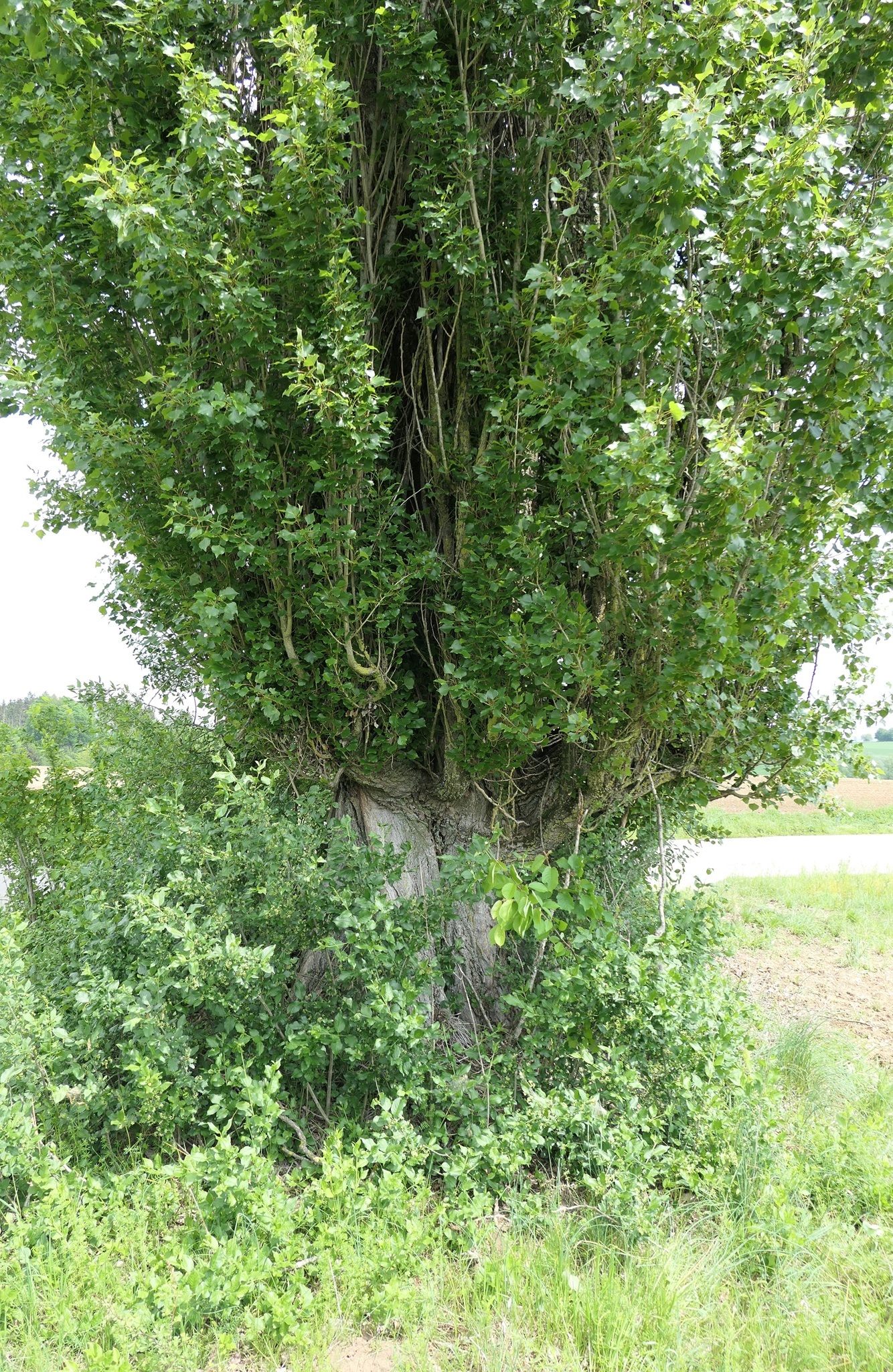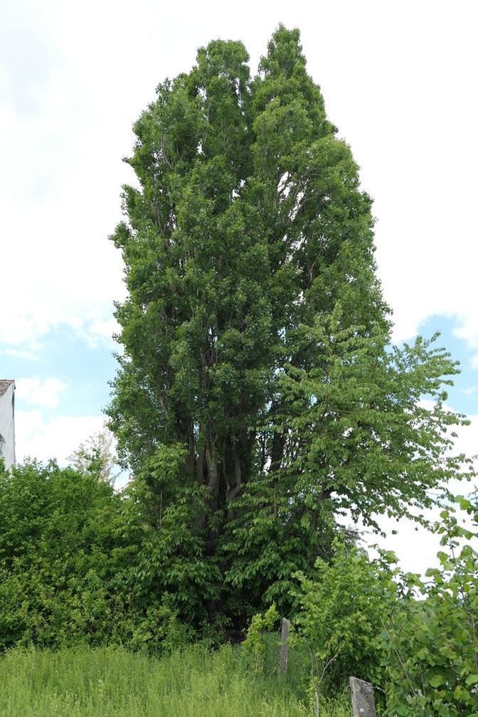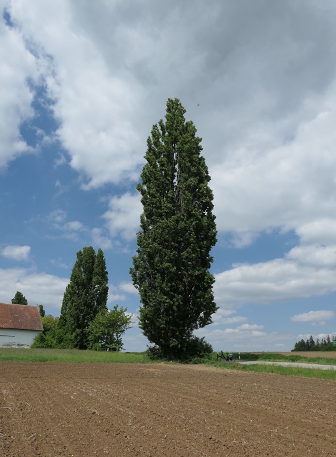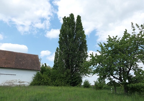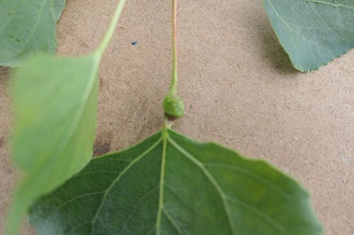 Die Blattstielgallen (kleines Bild unten) kommen häufig bei Schwarzpappel und der Pyramidenpappel vor, kaum bei der Kanadischen Pappel. Großes Bild: im Hintergrund die Pyramidenpappel (1).