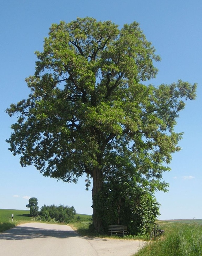 Die Robinie bei Tünzhausen steht in einer Weggabelung neben einem Feldkreuz. Beides wird von einem Fliederbusch und einer Sitzbank begleitet.