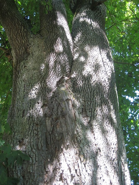 Der spitze Winkel der Stammverzweigung ist ein Schwachpunkt dieses Baumes, der bei starker Belastung, zum Beispiel bei Sturm, zum Bruch an dieser Stelle führen kann.