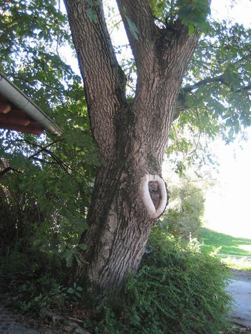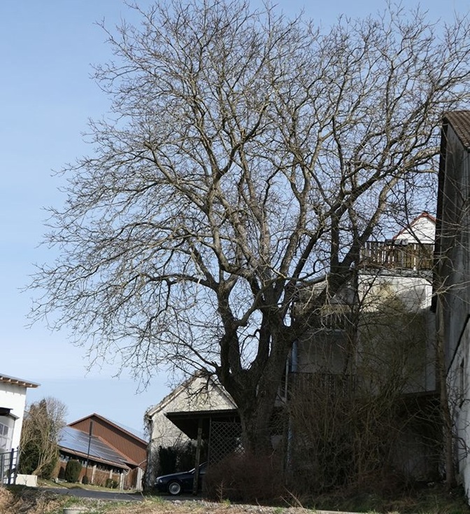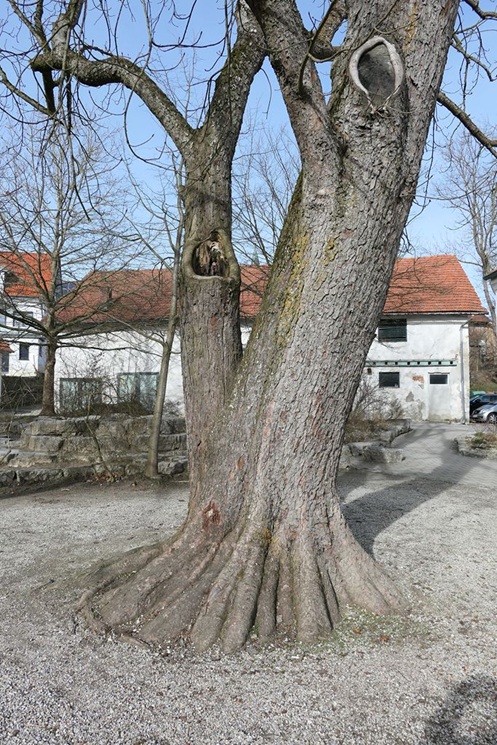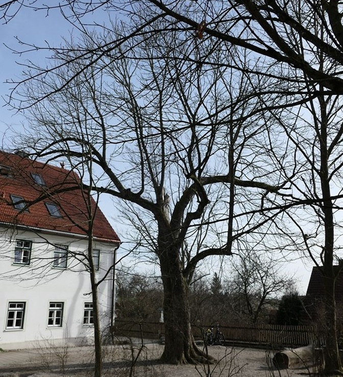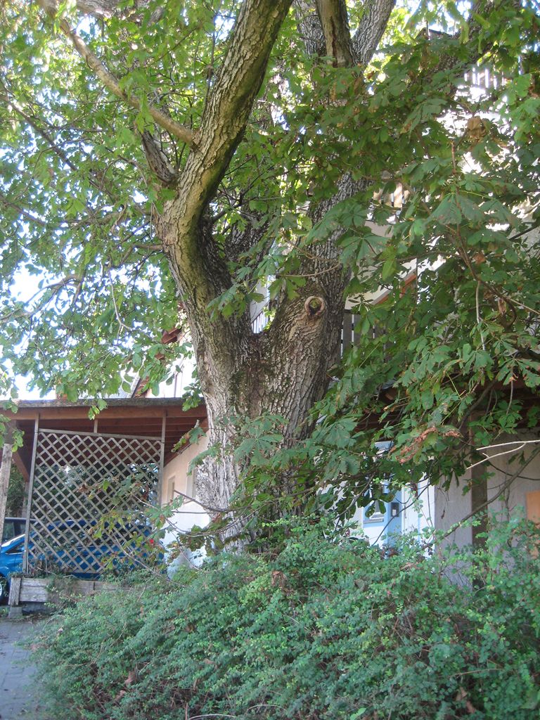 Im Wirtsgarten des Gasthauses Hörger in Hohenbercha, zwischen Haus und Kinderspielplatz, steht eine dicke Rosskastanie. Nach den Stürmen im vergangenen Jahr mussten einige Kronäste und der Hauptstamm gekürzt werden, der Baum ist aber immer noch 17 m hoch.