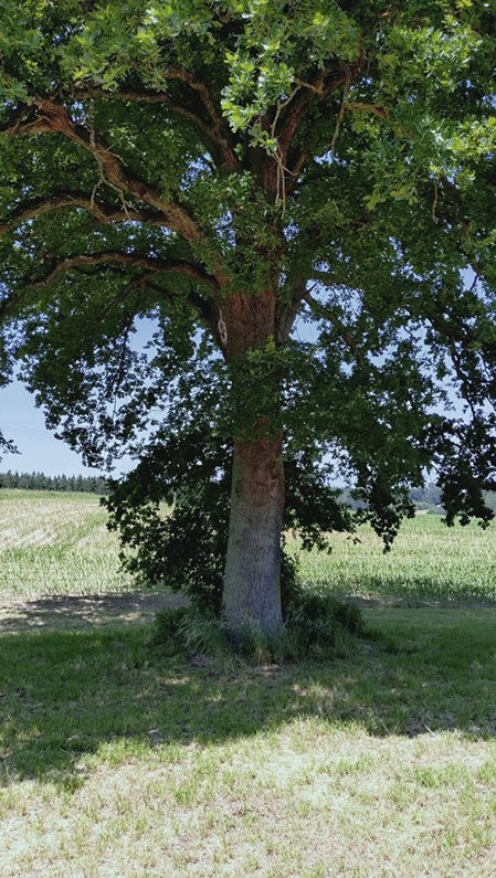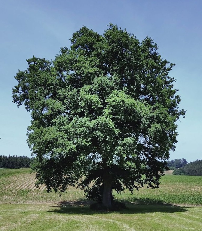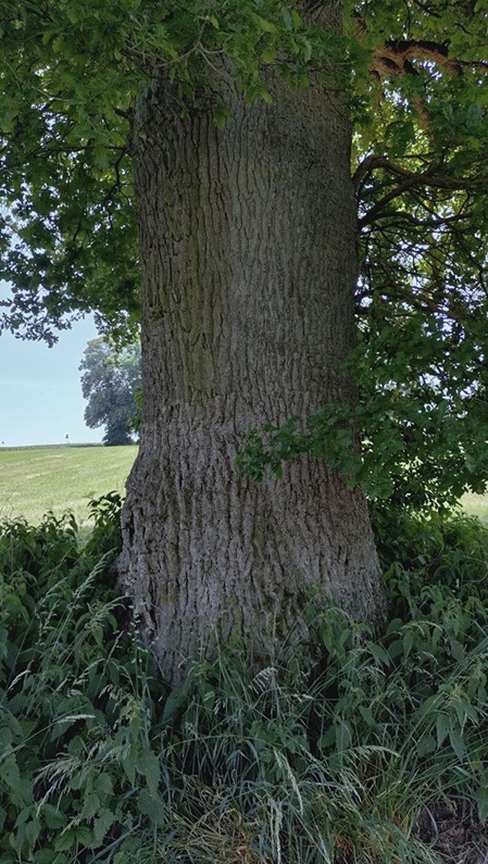 - es stehen hier zwei Stieleichen nebeneinander und bilden eine Krone, der Baum mit dem etwas stärkeren Stamm wird hier beschrieben