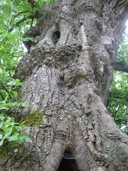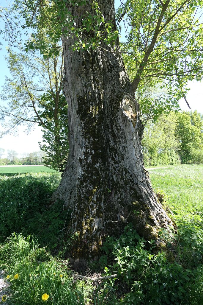 - Schäden: Stammriß mit Querstreben gesichert, kleinerer Hohlraum ist ausgemauert, Baumhöhlen, an der Stammbasis bis ca. 130 cm Höhe Wucherungen