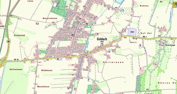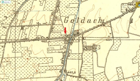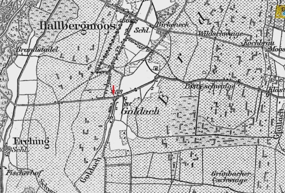 1865, also 14 Jahre später, wurde in der Nachbarschaft ein Gasthaus, der heutige „Alte Wirt“, errichtet, in dem u. a. die den Branntkalk transportierenden Fuhrwerker eine Rastmöglichkeit fanden. Beides ist auf dem Positionsblatt von 1860 im Maßstab 1:25.000 dargestellt (Abb. 3). Auch das vorbei fließende Gewässer heißt hier bereits Goldach. Das nordwestlich von Goldach entstehende Straßendorf Hallbergmoos ist bereits zu erkennen.
