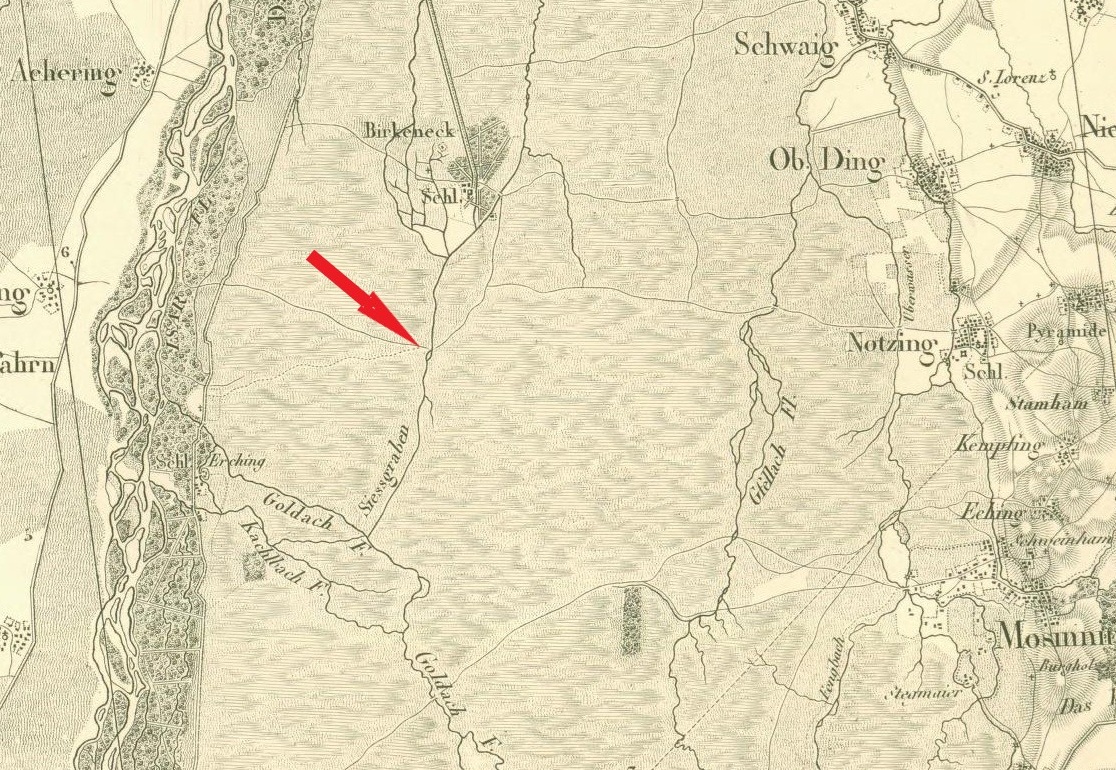 Das Niedermoor zwischen Freising und Erding blieb lange von einer intensiven Entwässerung verschont. Zwar gab es erste Entwässerungsversuche bereits ab 1567. Die Goldach verlief damals weiter westlich. Ihr heutiger Verlauf war ursprünglich ein ab 1701 angelegter Entwässerungsgraben mit wechselnden Bezeichnungen (Abb. 1: Siessgraben, Abb. 2: Wildmoosgraben). Nach dessen Fertigstellung konnte auf einer der wenigen Schotterterrassen im Moos Schloss und Schwaige Birkeneck entstehen. Einige andere Kultivierungsversuche blieben bis Anfang des 19. Jahrhunderts erfolglos.