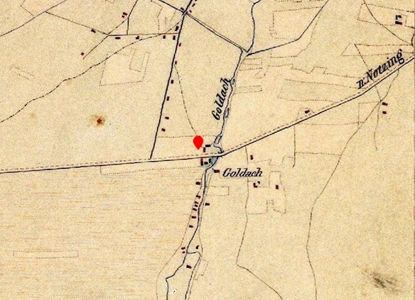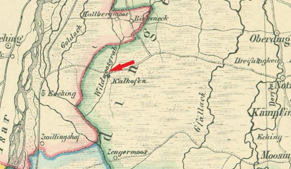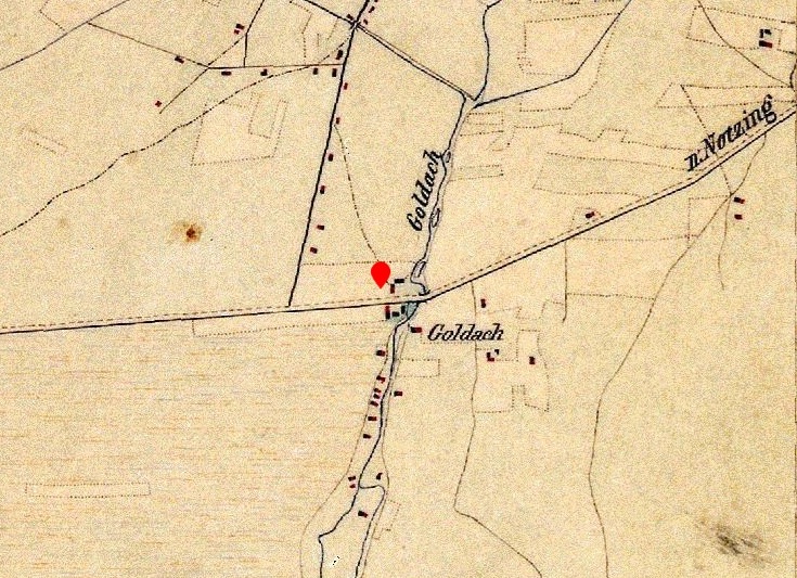 1851 erbaute Ulrich Grabmüller aus Hallbergmoos einen Kalkofen an der Stelle, wo die "Districtstraße" zwischen Erding und Neufahrn das Gewässer der Goldach quert (in der Karte von Gustav Wenng noch als Wildmoosgraben bezeichnet).